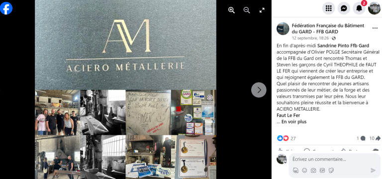Merci à Olivier POLGE, secrétaire général de la Fédération Française du Bâtiment du Gard pour son soutien sur Facebook pour le lancement du bébé ACIERO METALLERIE chez Faut le Fer Ferronnerie d'Art !